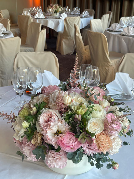 Von der, mit einem Kranz geschmückten Braut-Limousine, über die Brautjungfern-Sträuße, bis hin zum Schmuck für das Standesamt, die Kirche oder dem Partyraum - Mit viel Liebe richten wir alles für Sie her.